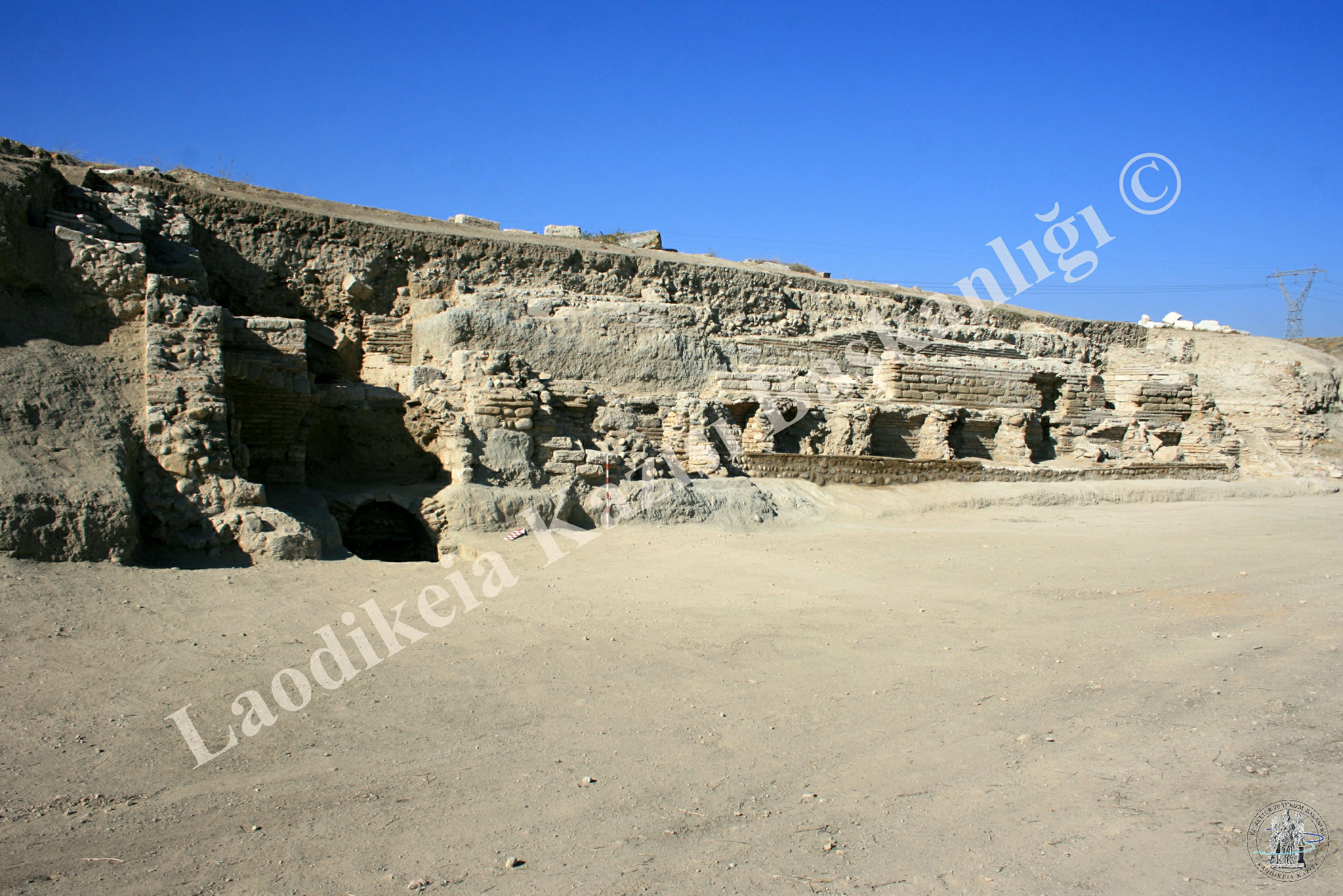 Bu alanda yapılan kazı sonuçlarına göre, topografyanın kuzeyden güneye doğru, eğimine uygun olarak mezar kompleksinin tabanına 0.45-0.80 m arasında değişen yüksekliklerde, sert kilden blokaj yapılarak düz bir taban oluşturulmuş ve mezar kompleksi bu tabanın üzerine inşa edilmiştir. Mezar kompleksi; üç katlı, düz çatılı, ikisi güneyde ve kuzeyde doğu-batı yönlü, bunların arasında ise güney kuzey yönlü yan yana uzanan toplamda beş adet tonozlu mezar odasından oluşmaktadır. Mezarlarda kireç harçlı tuğla, traverten ve çay taşı kullanılmış ve eğimli topografyaya göre inşa edilmiştir. Mezar kompleksi kazı verilerine göre MS 2. yy’dan MS 5. yy sonuna kadar sürekli olarak kullanılmış olup plan tipiyle Laodikeia’da bugüne kadar tespit edilen mezarlardan farklı olan geniş sülale mezarıdır.